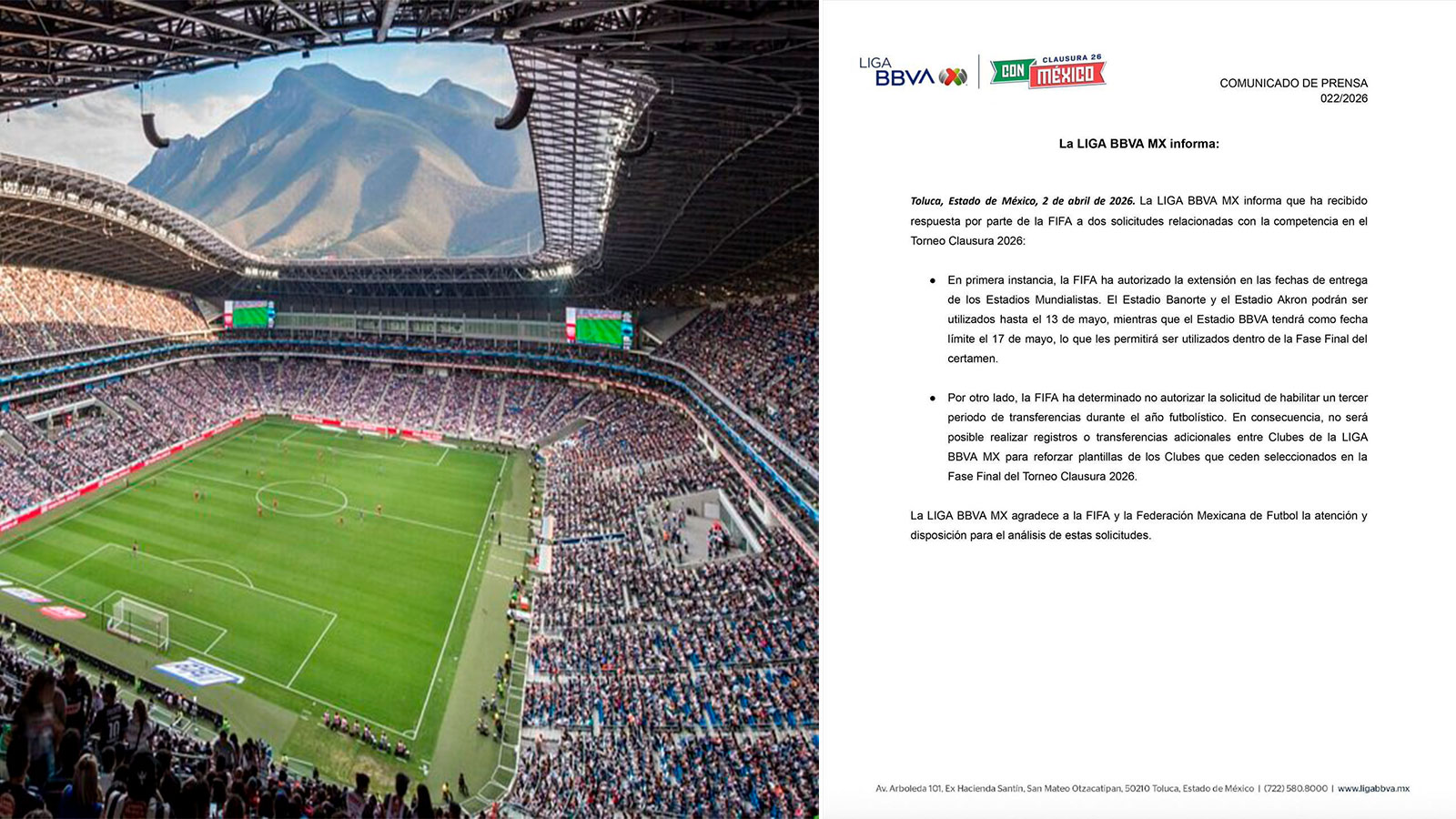 Finalmente, la Liga BBVA MX agradeció tanto a la FIFA como a la Federación Mexicana de Futbol por la disposición y el análisis realizado sobre estas solicitudes, destacando la coordinación entre organismos en un año clave rumbo al Mundial 2026.