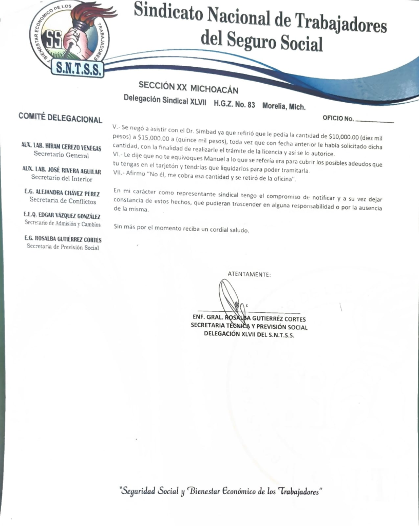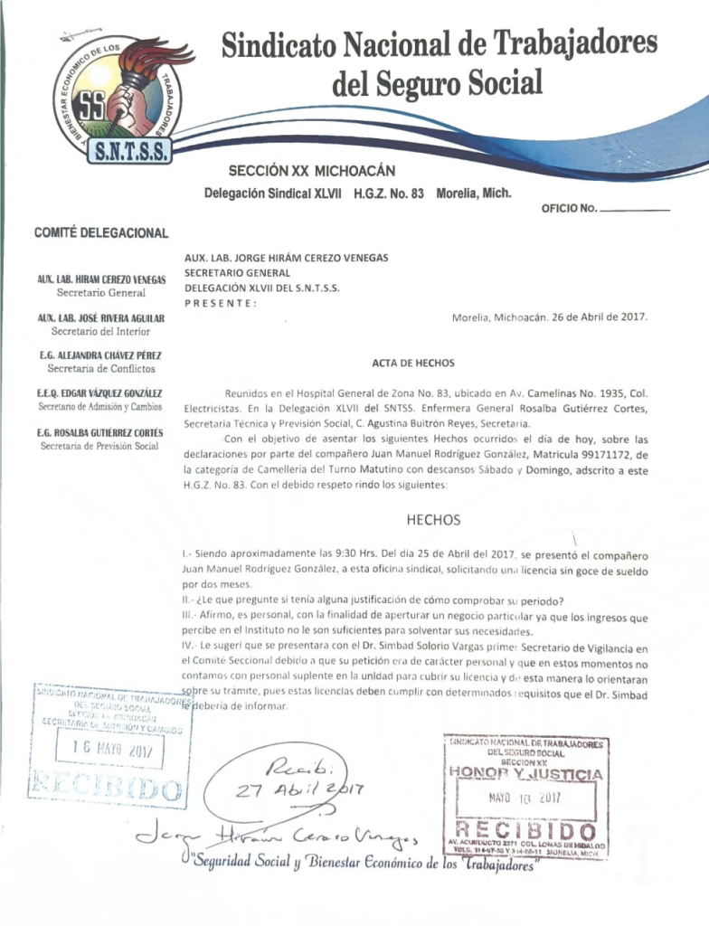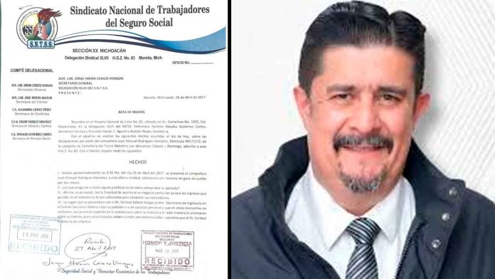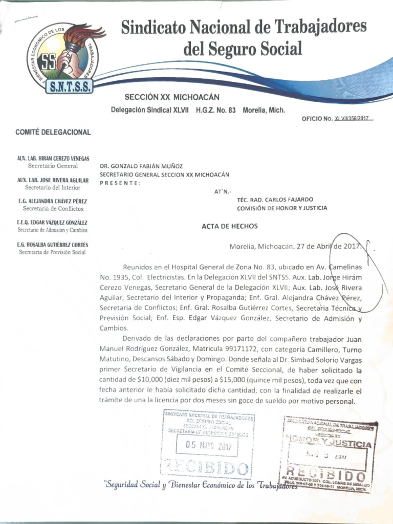 De acuerdo con un “Acta de Hechos” emitida por la Delegación Sindical XLVII del HGZ No. 83 de Morelia, bajo el oficio XLVII/356/2017, fechado el 27 de abril de 2017, se asentó la declaración del trabajador Juan Manuel Rodríguez González, matrícula 99171172, con categoría de camillero en turno matutino, quien acusó al entonces integrante del Comité Seccional de haberle solicitado entre 10 mil y 15 mil pesos.