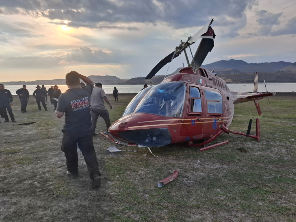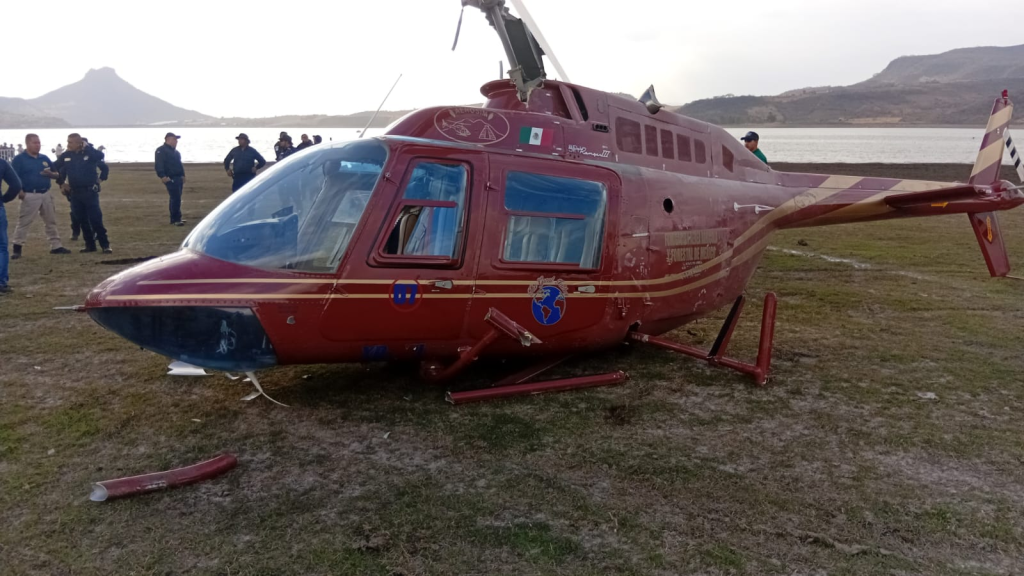 Zitácuaro, Mich.- Viernes 03 de abril de 2026.- La tarde de este viernes se registró la caída de un helicóptero en un campo abierto aledaño a la Presa del Bosque, ubicada en el municipio de Zitácuaro, hecho que dejó al menos cinco personas lesionadas.