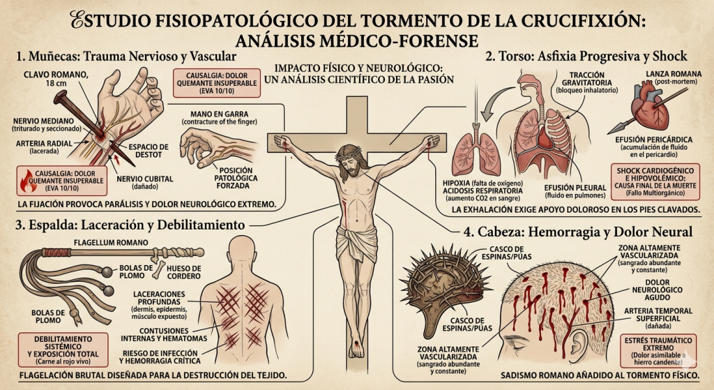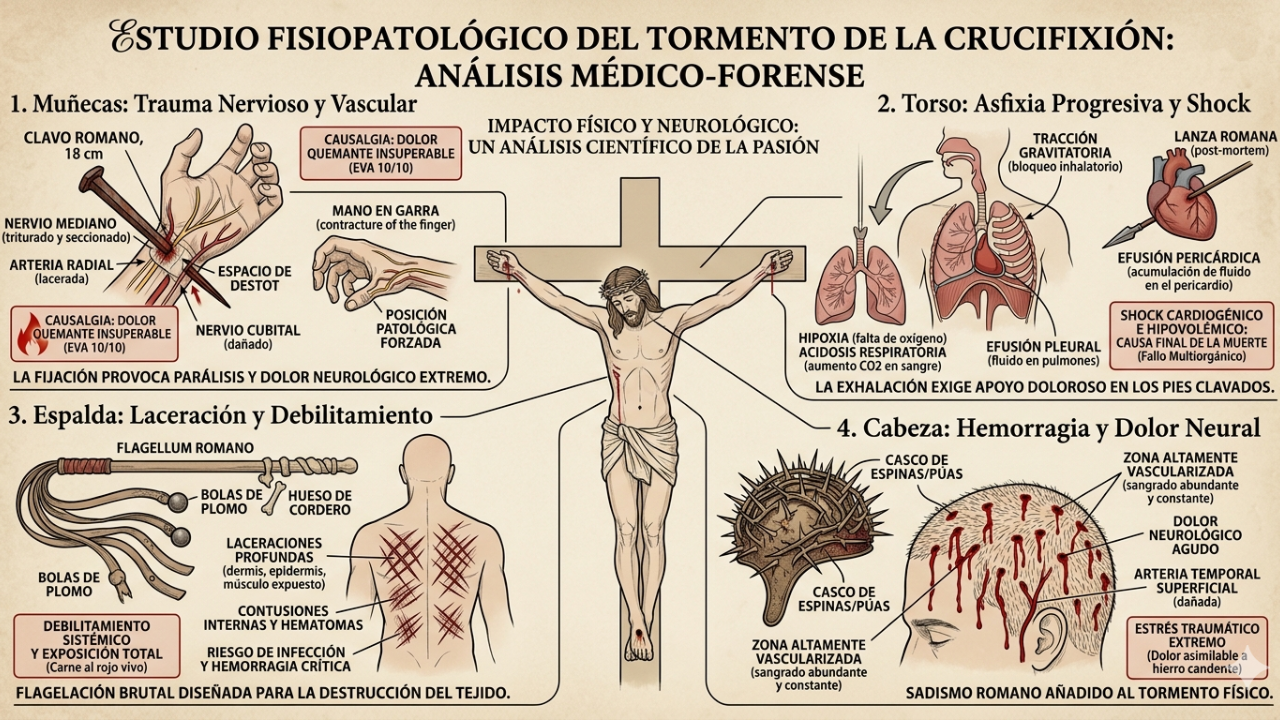 Alguna vez te has preguntado ¿qué le sucede al cuerpo humano durante una crucifixión? Expertos en fisiología y medicina analizan las causas clínicas de la muerte de Jesús: desde el trauma nervioso de los clavos hasta el fallo multiorgánico final.