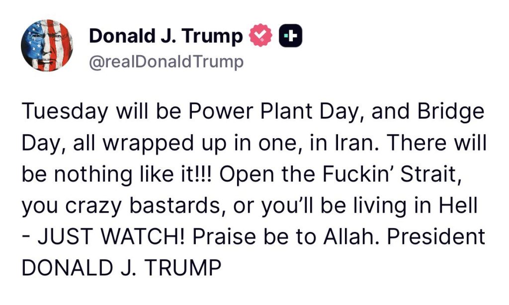 A través de su cuenta oficial, Trump escribió que el próximo martes podría convertirse en un “día de plantas energéticas y puentes” en territorio iraní, además de exigir la apertura del Estrecho de Ormuz, una de las rutas marítimas más importantes para el transporte mundial de petróleo.