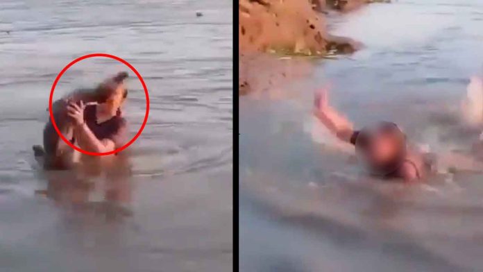 De acuerdo con las imágenes compartidas en la plataforma X, la mujer se encontraba dentro del agua cuando detectó la presencia del reptil a corta distancia. Al percatarse, reaccionó de inmediato y se alejó del lugar, evitando un posible incidente.