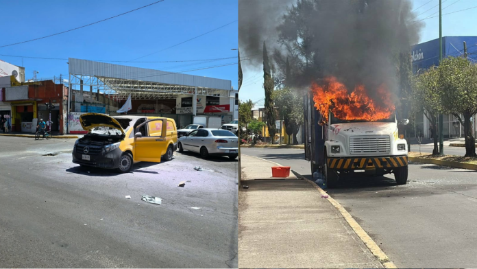 Frente a la FGE incendiaron un camión repartidor de agua Bonafont. Sobre el mismo Libramiento Sur-Poniente y la avenida Siervo de la Nación, los sujetos prendieron fuego a un camión de la empresa Jumex.