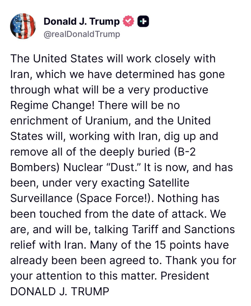 A través de un mensaje publicado en su cuenta oficial, Trump indicó que Estados Unidos “trabajará de cerca con Irán” en lo que describió como un proceso para desenterrar y retirar material nuclear profundamente enterrado. En el mismo comunicado, afirmó que no habrá enriquecimiento de uranio y que estas acciones se realizarían bajo vigilancia satelital