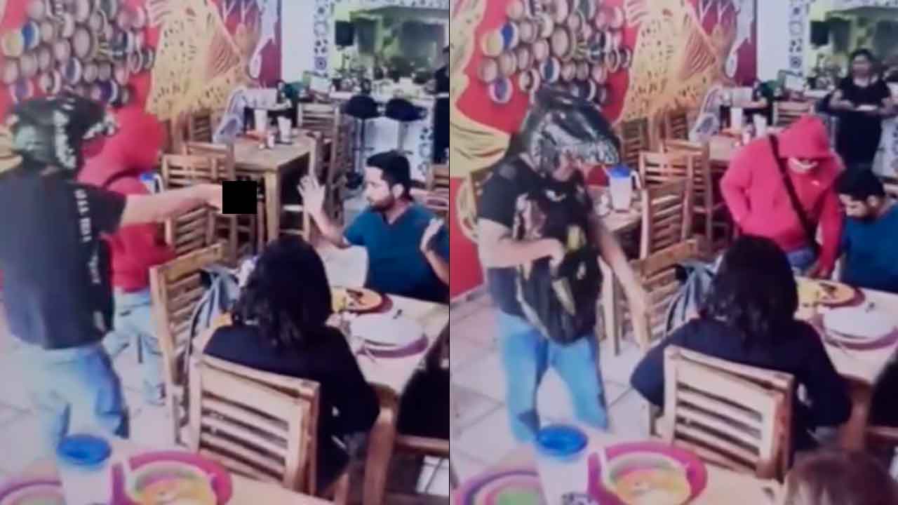 El incidente se registró la tarde del pasado miércoles en un negocio ubicado en la colonia Jardines de Santa Clara, muy cerca de la Pirámide de Ciudad Azteca. En las grabaciones se observa la llegada de dos hombres; uno de ellos, portando un casco de motociclista, saca un artefacto de una mochila para amagar a los presentes, mientras que su cómplice, quien llevaba el rostro cubierto con un cubrebocas, pasa mesa por mesa quitando objetos de valor y pertenencias a los clientes.