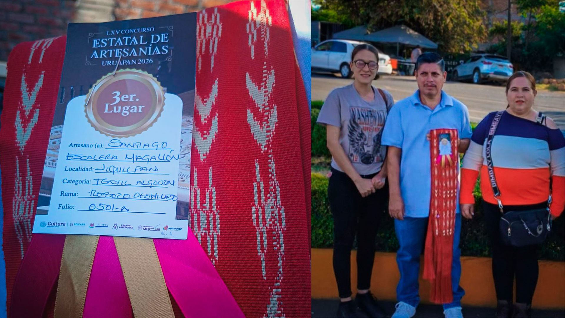 Artesanos de Jiquilpan, Santiago Escalera Magallón, Silvia De Orta Ortega y María Dolores Gómez Zepeda, obtuvieron el tercer lugar con la elaboración de un rebozo durante el 65 Concurso Estatal de Artesanías de Domingo de Ramos, realizado en Uruapan en 2026.