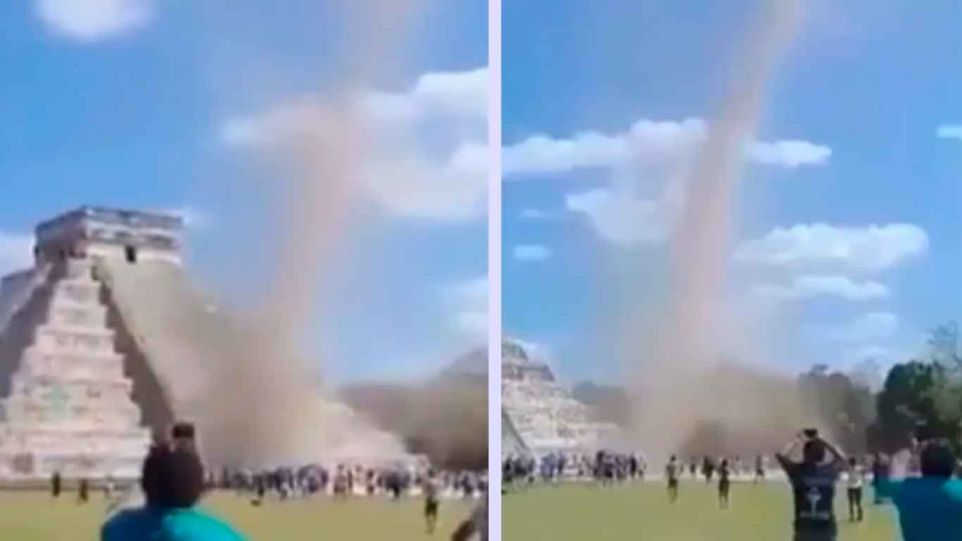 Un remolino de polvo captó la atención de los visitantes en la zona arqueológica de Chichén Itzá, frente al Templo de Kukulcán. Este fenómeno se ha viralizado en redes sociales.