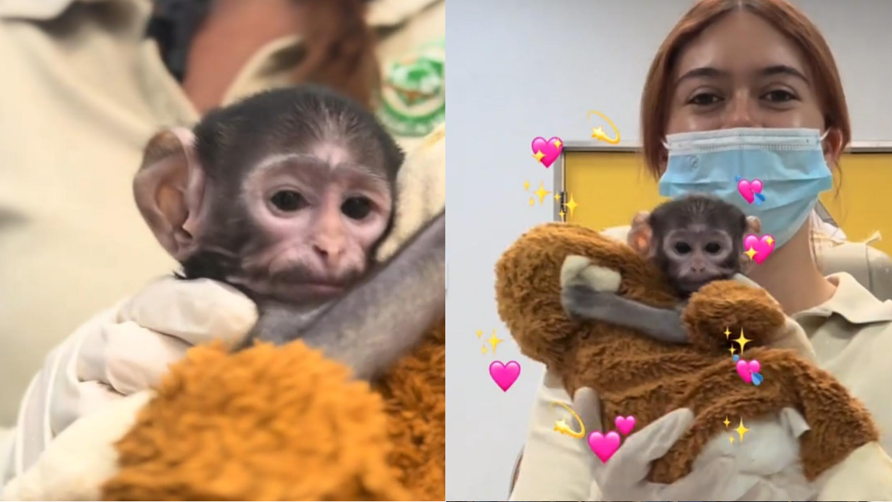 Como parte de su tratamiento, cuidadores le colocaron un peluche que funciona como sustituto del contacto materno, una medida común en la atención de primates recién nacidos para reducir el estrés y favorecer su estabilidad emocional.