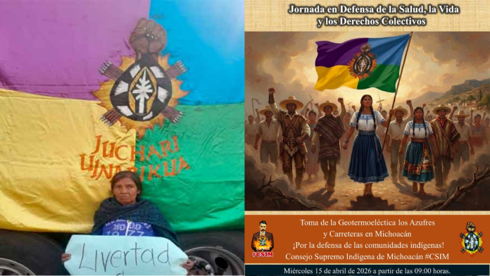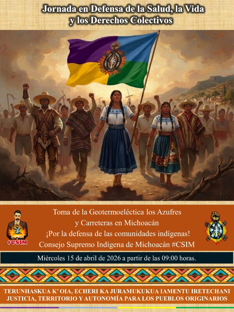 El Consejo Supremo Indígena de Michoacán (CSIM) anunció la Jornada en Defensa de la Salud, la Vida y los Derechos Colectivos para el miércoles 15 de abril de 2026, a partir de las 09:00 horas.