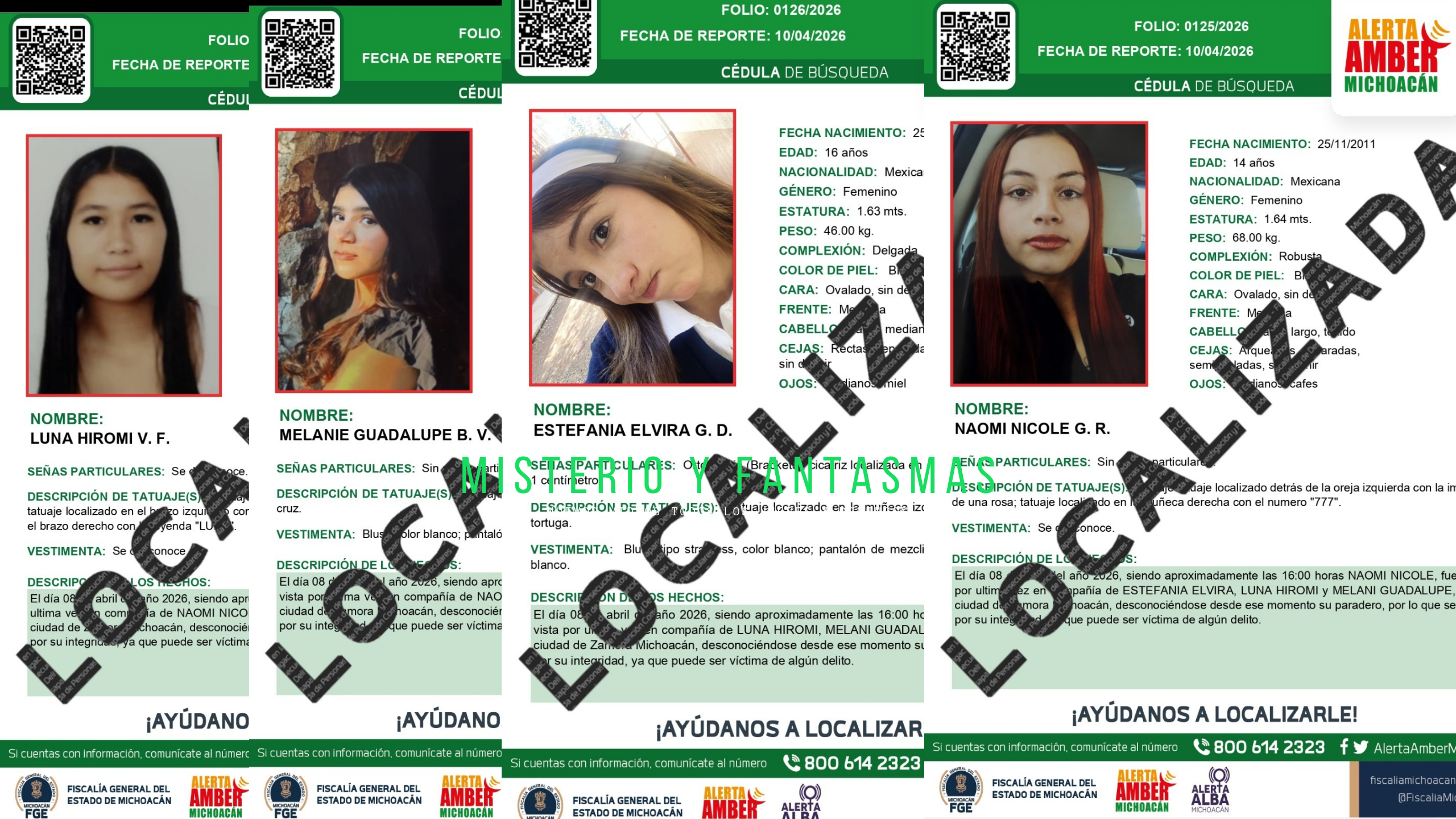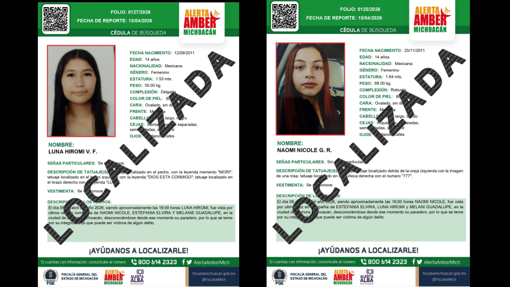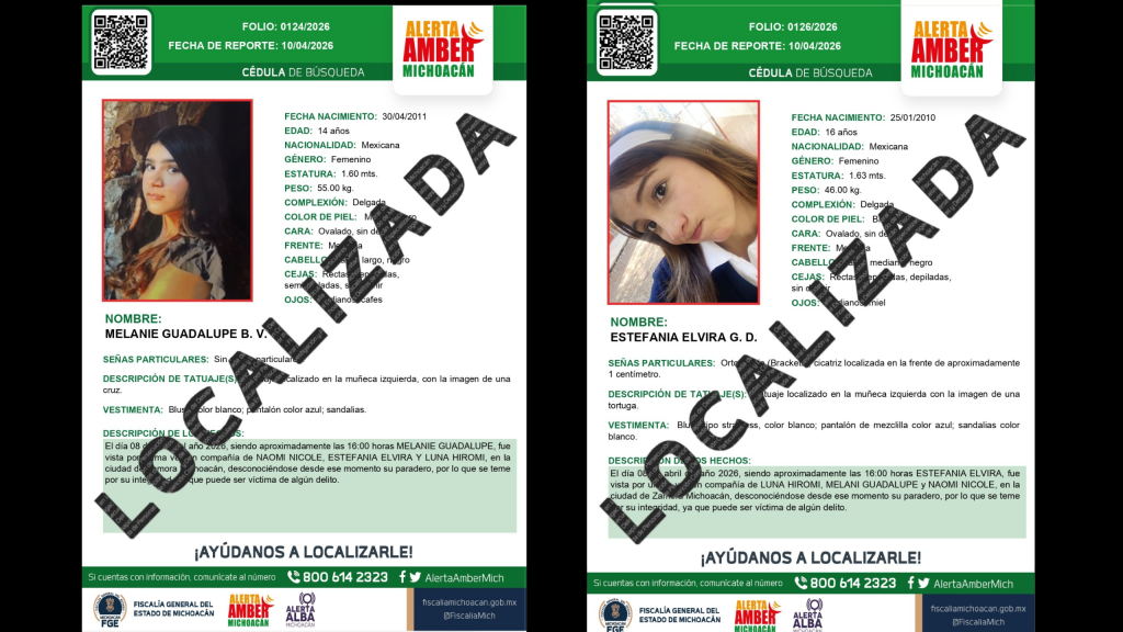 Zamora, Michoacán, a 14 de abril de 2026.- La Fiscalía General del Estado de Michoacán (FGE) informa que fueron localizadas sanas y salvas las cuatro menores que habían sido reportadas como desaparecidas en el municipio de Zamora, tras perderse comunicación con ellas desde el pasado 8 de abril, siendo reportada su desaparición ante las autoridades el día 10.