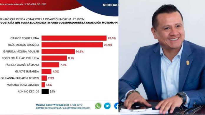 Morelia, Michoacán, 15 de abril de 2026.- Carlos Torres Piña, actual Fiscal de Michoacán se mantiene como favorito para ser el candidato a la gubernatura por la coalición Morena-PT-PVEM en el 2027, de acuerdo a la casa encuestadora Massive Caller.