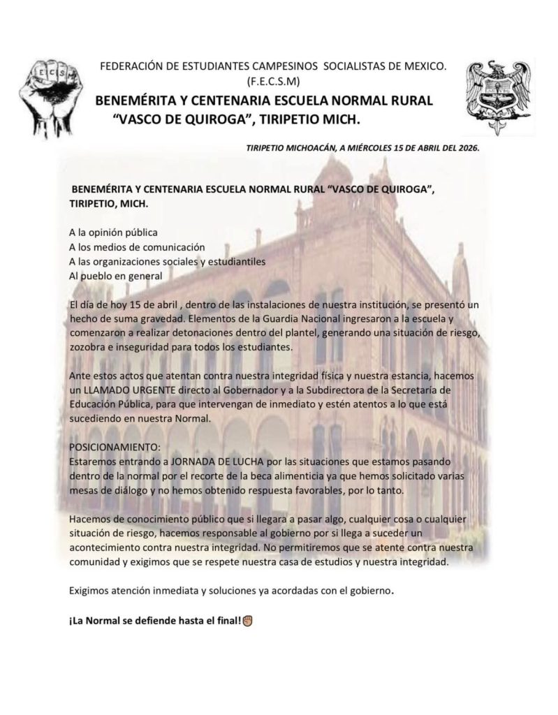 Estudiantes de la Escuela Normal Rural Vasco de Quiroga denunciaron la presunta irrupción de elementos de la Guardia Nacional al interior del plantel, donde —aseguran— se realizaron detonaciones que generaron temor, incertidumbre y riesgo entre la comunidad estudiantil.