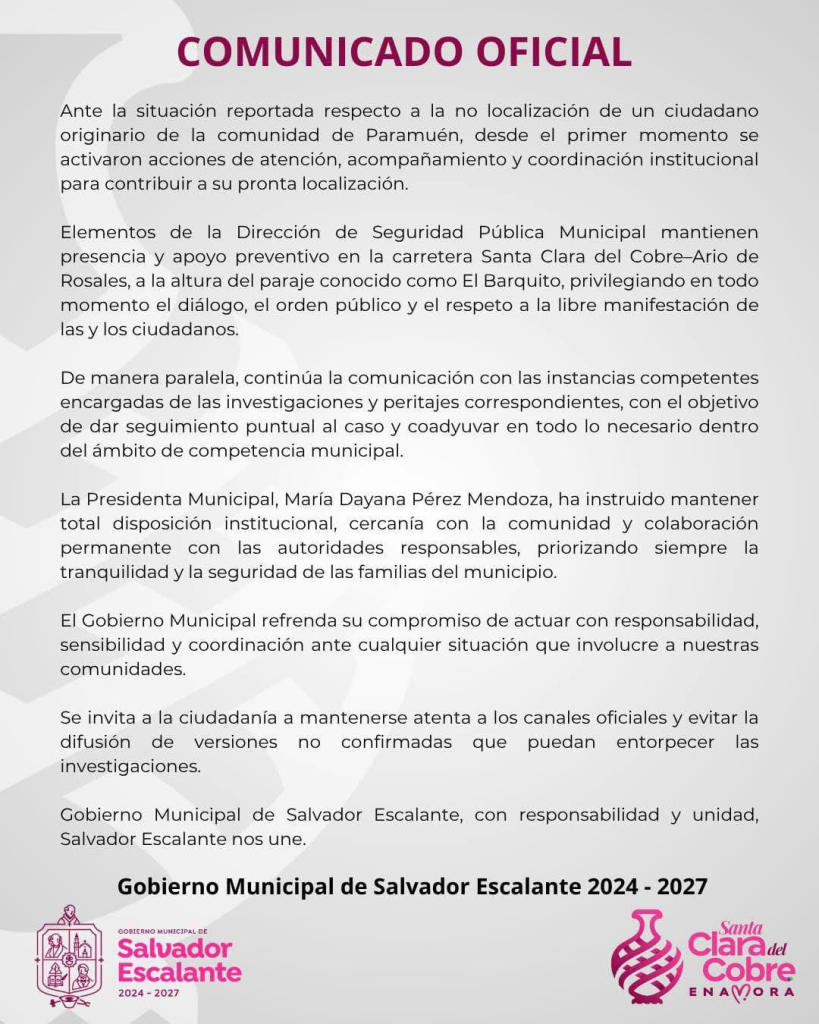 Morelia, Michoacán; a 15 de Abril de 2026.-El Gobierno Municipal de Salvador Escalante informó que, tras el reporte de la desaparición de un ciudadano originario de la comunidad de Paramuén, se activaron de inmediato acciones de atención, acompañamiento y coordinación institucional para contribuir a su pronta localización.