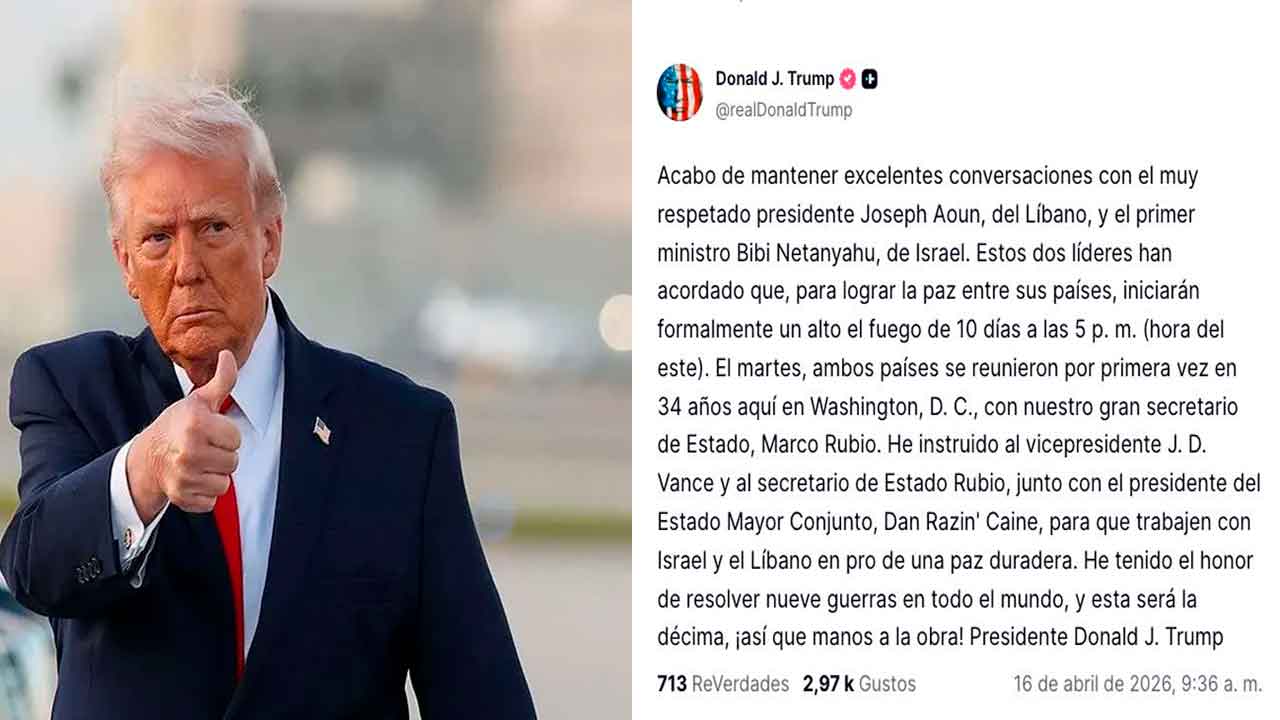 El presidente de Estados Unidos, Donald Trump, anunció un acuerdo de alto al fuego de 10 días entre Israel y Líbano, en lo que calificó como un avance histórico para la estabilidad en Medio Oriente.
