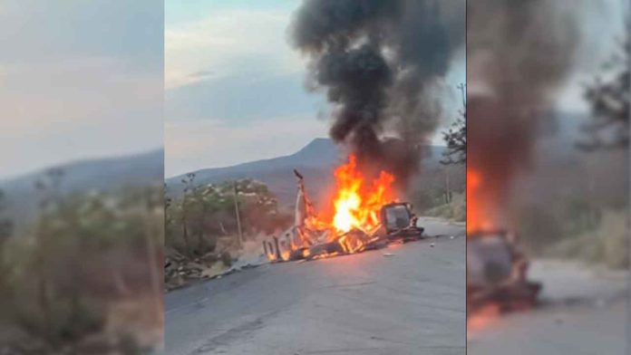 Buenavista Tomatlán, Mich.- 17 de abril de 2026.- Delincuentes se apoderaron de un camión de carga y lo quemaron para bloquear la circulación, en la carretera Buenavista- Los Reyes, presuntamente tras un enfrentamiento entre bandas antagónicas de criminales.