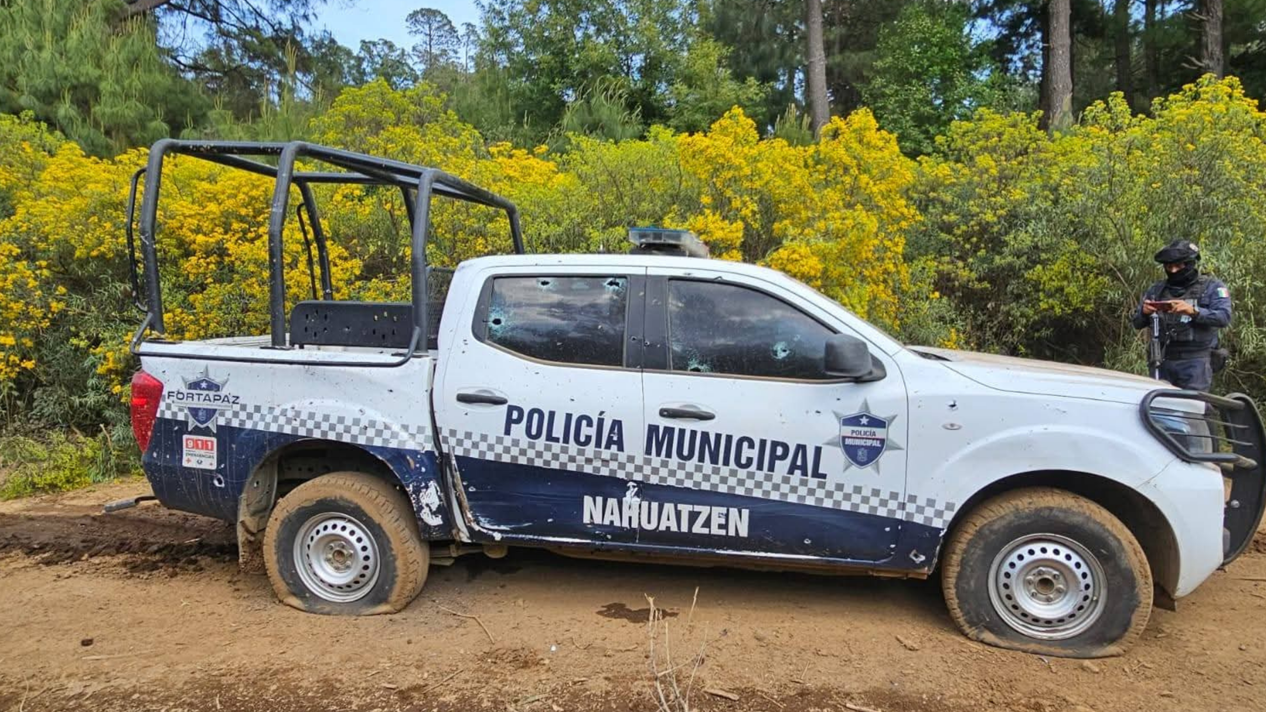 Nahuatzen, Mich.- 17 de abril de 2026.- Presuntos criminales atacaron con armas largas y explosivos arrojados desde drones a elementos de la Policía Municipal de Nahuatzen en un camino de terracería; afortunadamente, los uniformados resultaron ilesos.