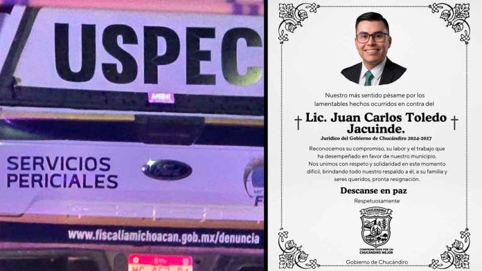 Chucándiro/Morelia, Mich.- Viernes 17 de abril de 2026.- Juan Carlos Toledo Jacuinde, abogado de profesión, maestro y quien se desempeñaba como asesor jurídico del Ayuntamiento de Chucándiro, murió en el Hospital San Miguel, ubicado en la ciudad de Morelia, a consecuencia de las severas lesiones que sufrió tras ser brutalmente golpeado en el citado municipio, informaron autoridades policiales.