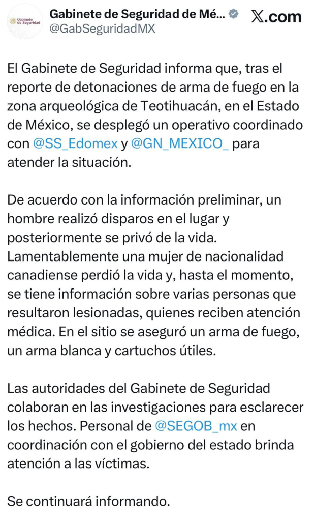 Minutos después, se informó que el presunto agresor se habría disparado, falleciendo también en el lugar. Asimismo, algunas personas resultaron lesionadas al intentar resguardarse y descender apresuradamente de la pirámide.