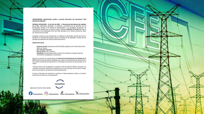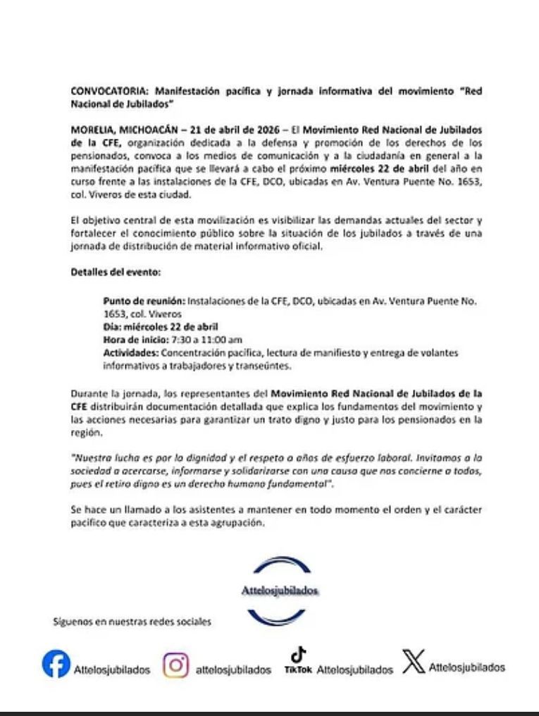 Morelia, Michoacán; a 21 de Abril de 2026.-En Morelia, integrantes del movimiento nacional de jubilados de la Comisión Federal de Electricidad anunciaron que este miércoles 22 de abril llevarán a cabo una manifestación pacífica en las instalaciones de la División Centro Occidente, ubicadas en avenida Ventura Puente número 1633.