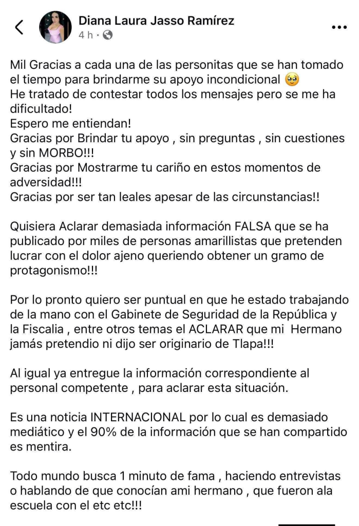 A 48 horas de la tragedia en la Zona Arqueológica de Teotihuacán, Diana Laura Jasso Ramírez, hermana de Julio César Jasso, el joven que asesinó a una turista y, tras quedar herido por la Guardia Nacional, se privó de la vida, emitió un contundente mensaje a través de sus redes sociales.