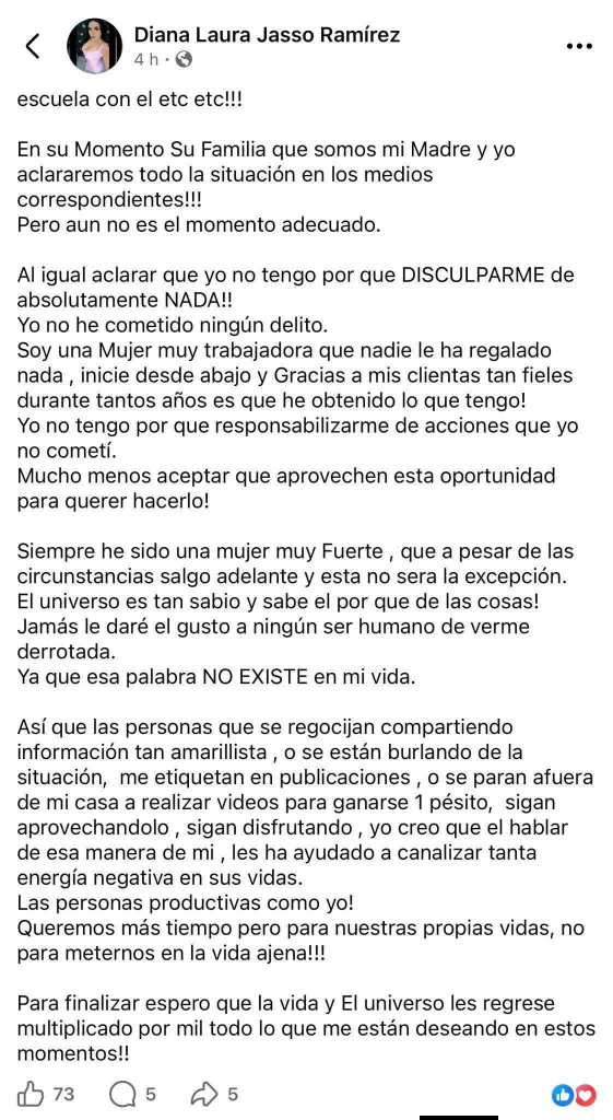 Diana Laura enfatizó que no tiene intención de ofrecer disculpas públicas por los actos de su hermano: “Aclarar que yo no tengo por qué disculparme de absolutamente nada. Yo no he cometido ningún delito y no tengo por qué responsabilizarme de acciones que yo no cometí”, advirtió en su perfil de Facebook.