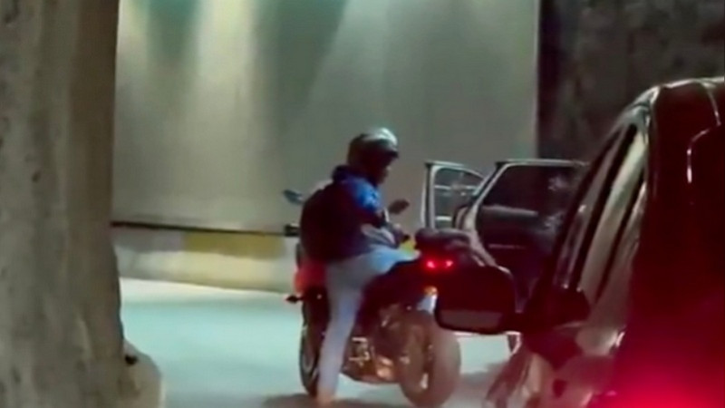 En las imágenes difundidas en redes sociales se observa cómo uno de los agresores amaga a la víctima, mientras su cómplice lo espera a bordo de una motocicleta y apunta con un arma a los ocupantes de otros vehículos detenidos.