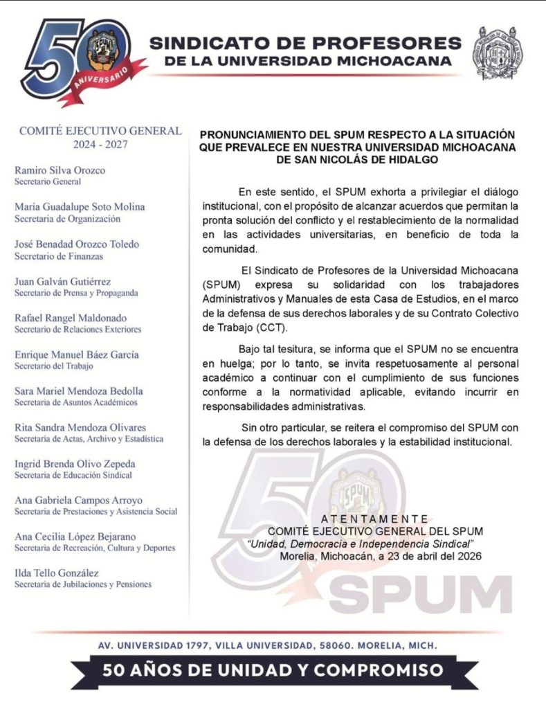 Morelia, Mich.- a 23 de abril de 2026.- La Universidad Michoacana de San Nicolás de Hidalgo (UMSNH) entregó al Juzgado Segundo Laboral en Morelia el listado del personal emergente que se requiere para ofrecer un servicio educativo digno a las y los más de 57 mil alumnos inscritos en los distintos programas que se ofertan.