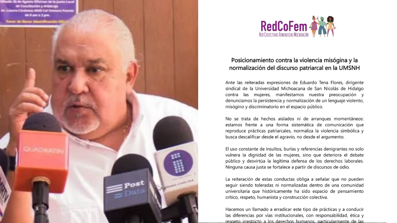 El movimiento feminista RedCoFem ha emitido un contundente posicionamiento frente a la ola de expresiones misóginas atribuidas a Eduardo Tena Flores, dirigente sindical de la Universidad Michoacana de San Nicolás de Hidalgo (UMSNH). La organización denuncia que el uso de lenguaje violento y discriminatorio por parte del líder no representa hechos aislados, sino una situaciones recurentes que vulnera la dignidad de las mujeres la máxima casa de estudios del estado.