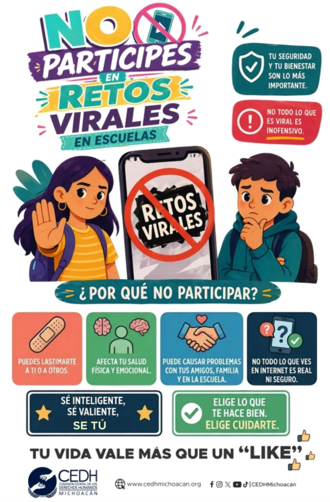 En el marco de la era digital, la Comisión Estatal de los Derechos Humanos (CEDH) de Michoacán emitió un enérgico llamado a la juventud y a la comunidad educativa para evitar la participación en los denominados “retos virales”. Bajo la premisa de que no todo lo que es tendencia resulta inofensivo, el organismo advirtió que estos desafíos pueden vulnerar gravemente la integridad física, la salud emocional y la estabilidad de las relaciones familiares y escolares de quienes los practican. La Comisión enfatizó que saber decir “no” ante la presión social en redes es el verdadero acto de valentía, promoviendo una cultura de responsabilidad y seguridad digital.