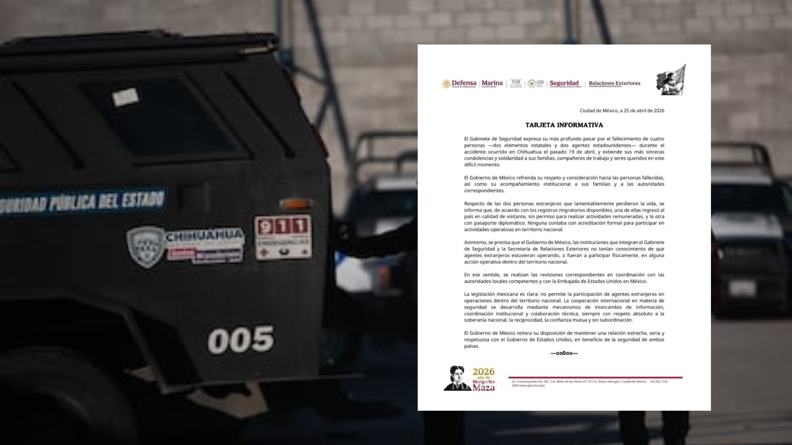 El Gobierno de México informó que no tenía conocimiento ni autorizó la participación de agentes extranjeros en operaciones dentro del territorio nacional, tras el fallecimiento de cuatro personas —dos elementos estatales y dos agentes estadounidenses— en un accidente ocurrido el pasado 19 de abril en el estado de Chihuahua.
