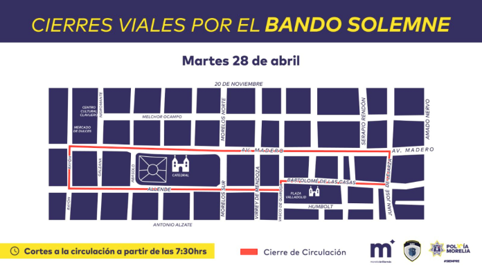 Con motivo del 485 aniversario de la fundación de Morelia, este martes 28 de abril se realizarán cortes a la circulación en el primer cuadro del Centro Histórico por la ceremonia del recorrido en Bando Solemne, para la develación de la programación de actividades.