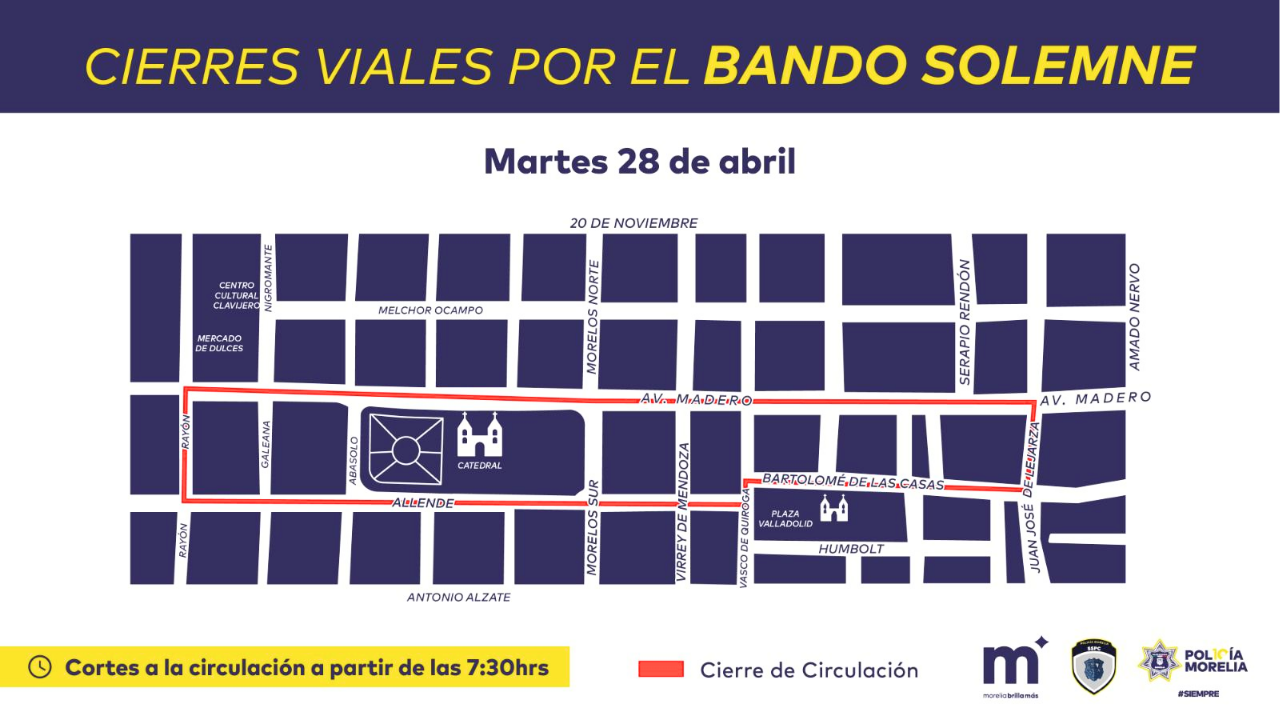 Los cierres viales iniciarán a partir de las 7:30 horas y contemplan las siguientes vialidades: Av. Madero, Allende, Abasolo, Rayón, Bartolomé de las Casas y Juan José de Lejarza, en el perímetro que comprende Catedral y Plaza Valladolid.