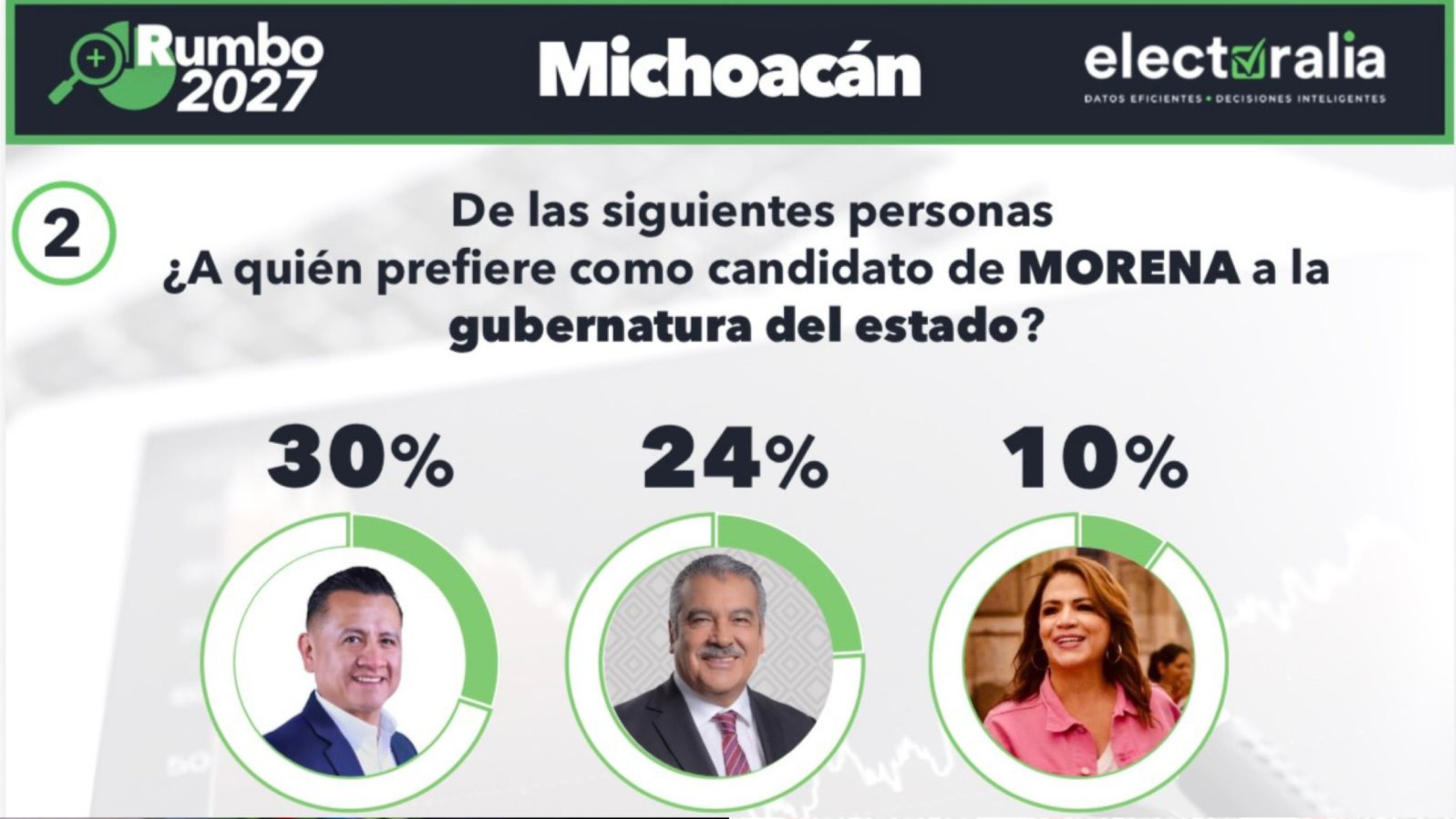 En la más reciente encuesta que presenta electoralia los números favorecen al ex secretario de gobierno con un 30 por ciento en las intenciones de votos, seguido por Morón con un 24 por ciento y a Fabiola Alanís con un lejano 10 por ciento.
